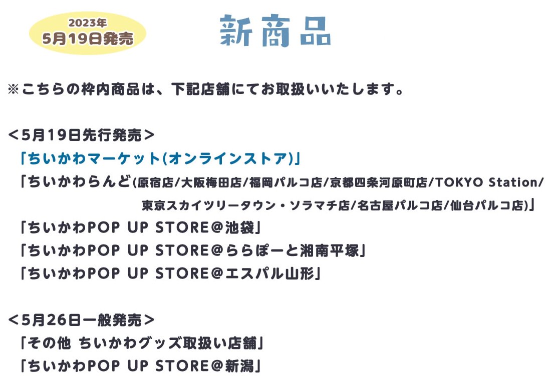 発売日、お取り扱いは画像をご確認ください🙇‍♀️ 🔍ちいかわインフォ   https://chiikawa-info.jp  🔍その他 ちいかわグッズ取扱い店舗   https://chiikawa-info.jp/p21/tenpo/#tenpo  #ちいかわ pic.twitter.com/B9TkajsA4j