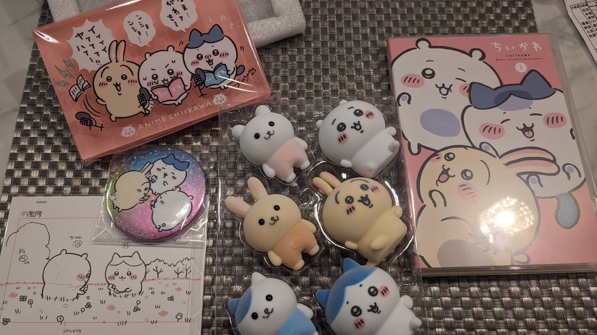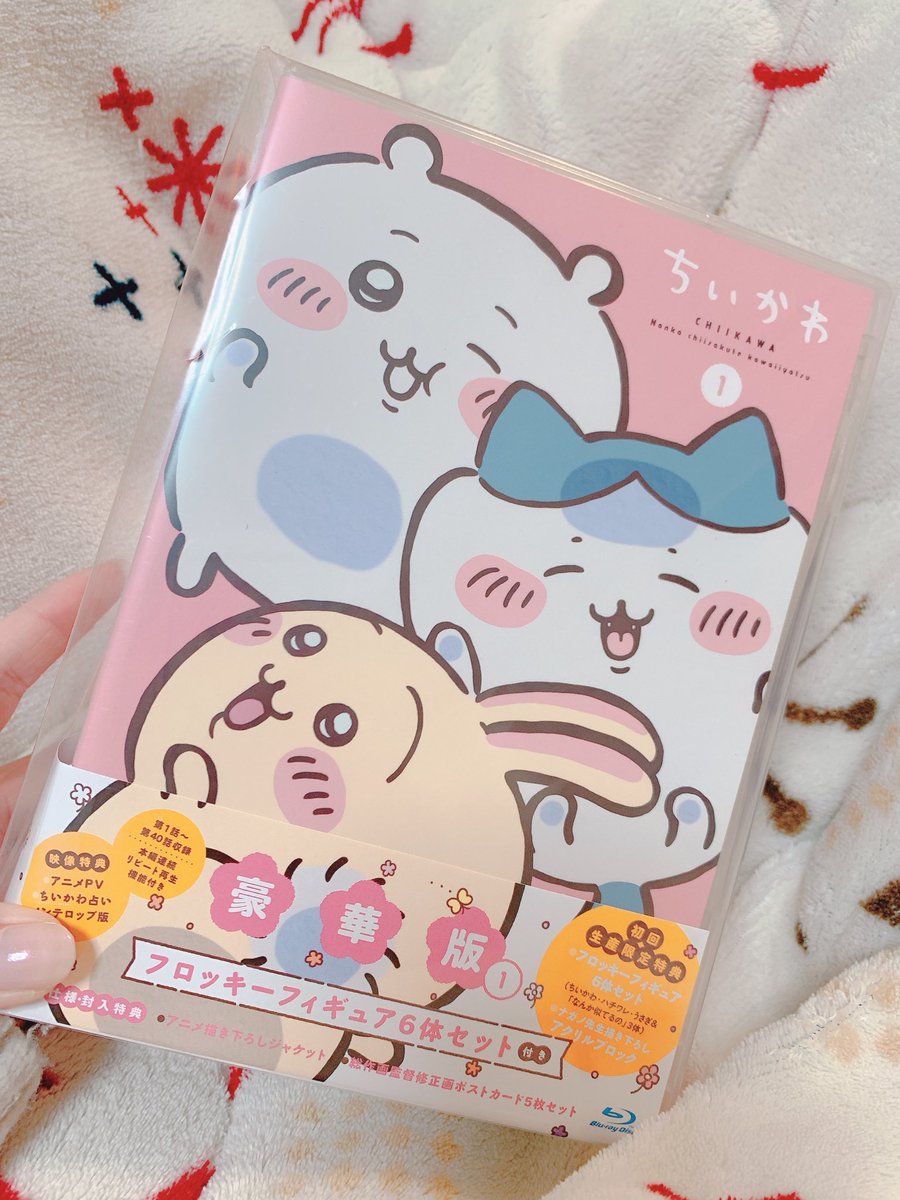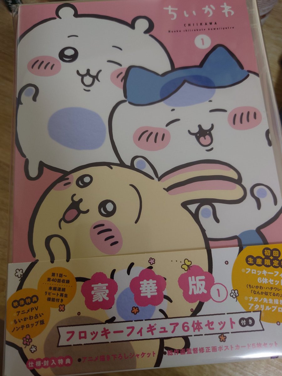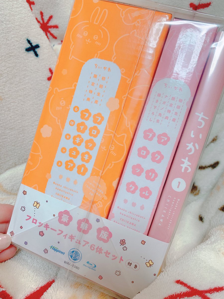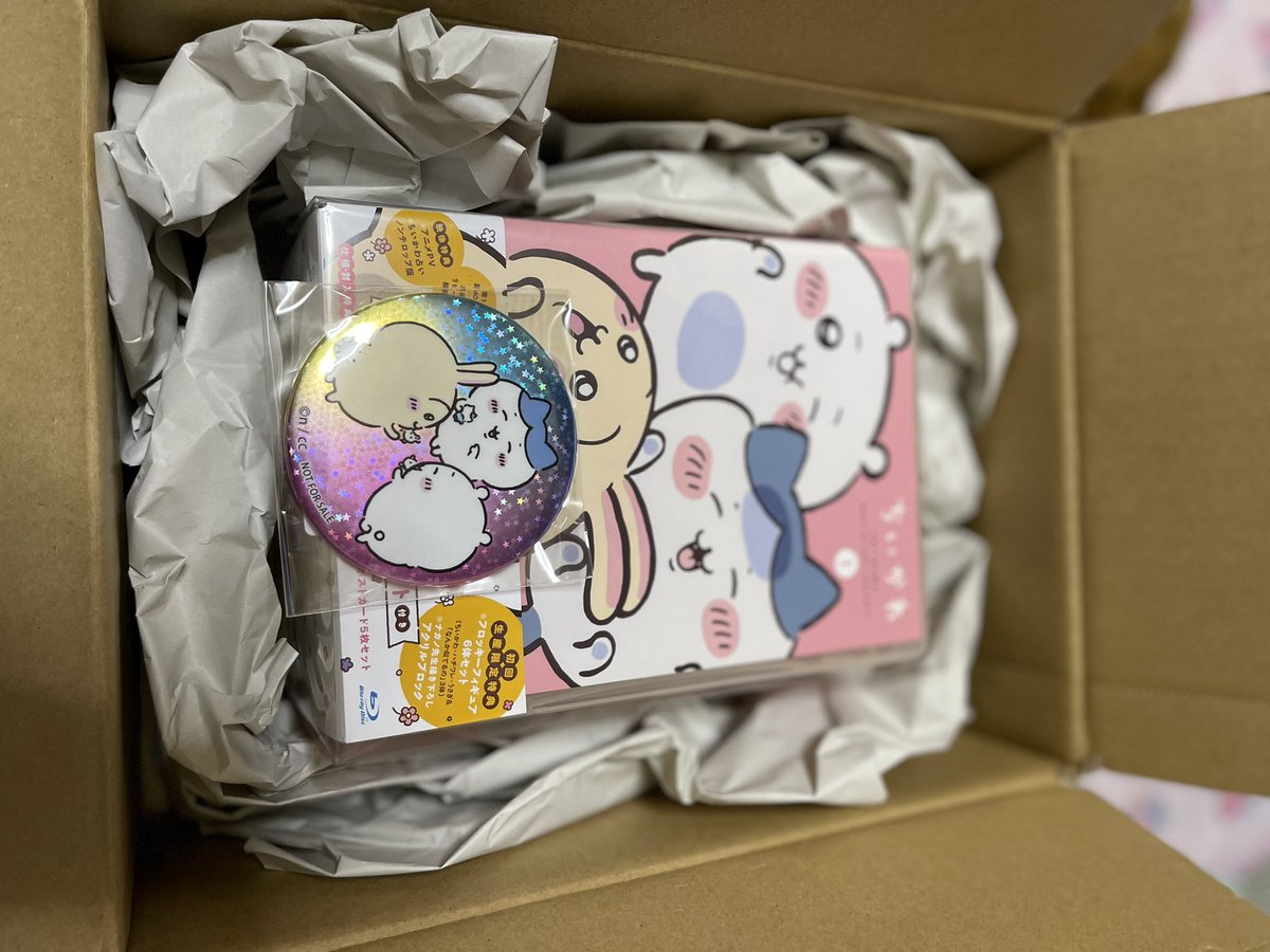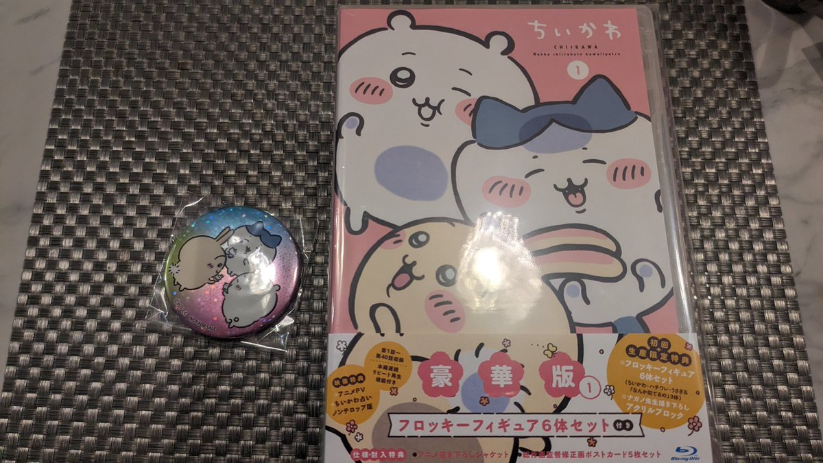 ちいかわマーケットより本日Blu-ray版アニメちいかわが届きました。フロッキーフィギュア6体セットの豪華版です。ちいかわマーケット限定特典のホログラム缶バッジが付いていました。 pic.twitter.com/jiIugkSP3p