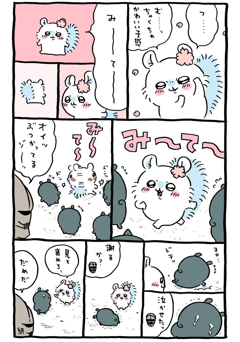 ちいかわ 桜の花を頭に乗せる話(モモンガ・労働の鎧さん)